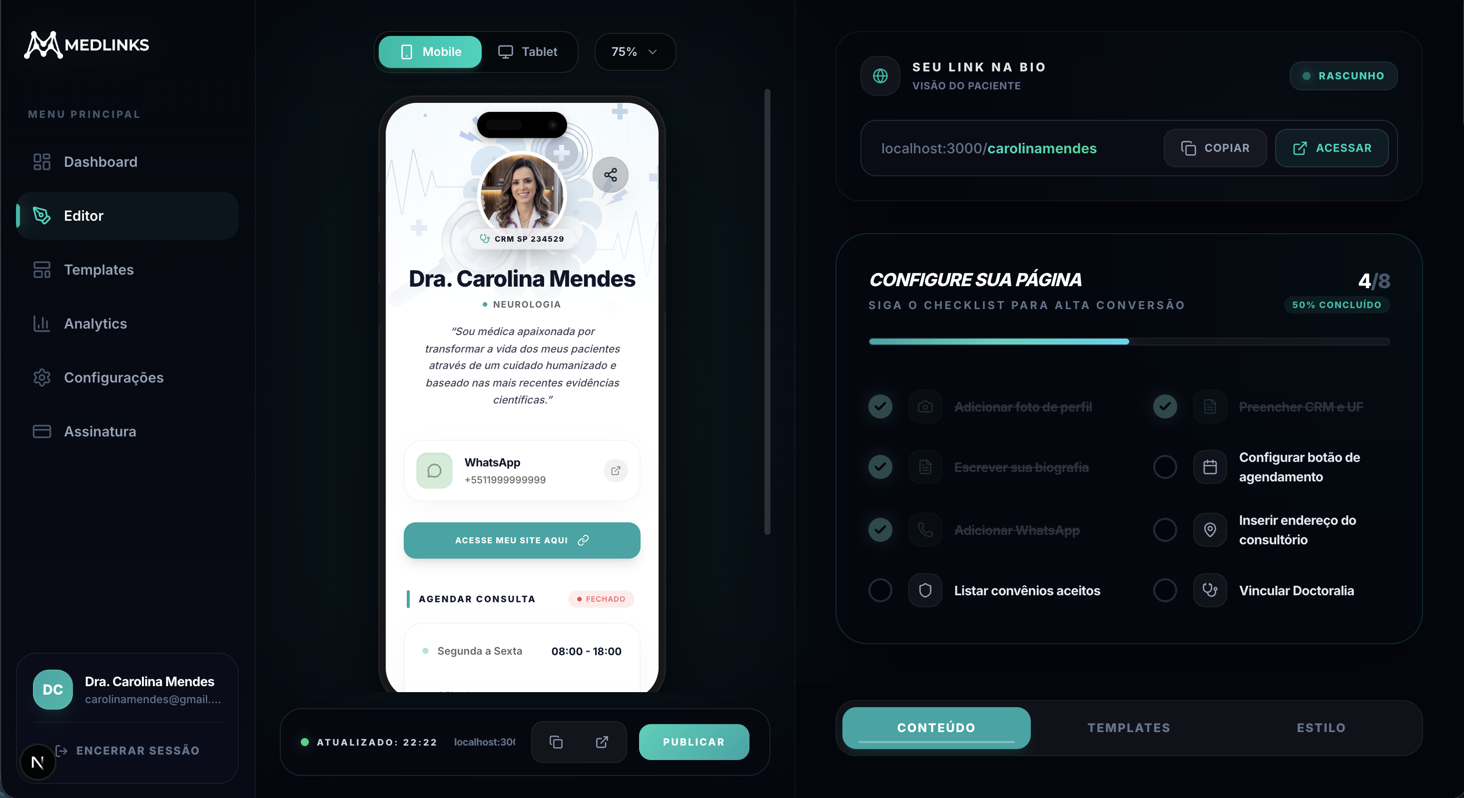 "Antes eu usava Linktree e os pacientes me ligavam perguntando onde agendar. Depois do MedLinks, chegam direto pelo botão. Minha agenda lotou mais rápido."