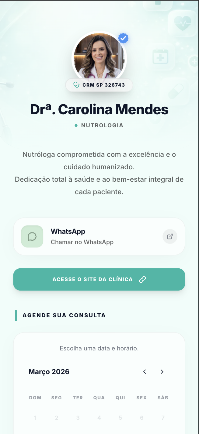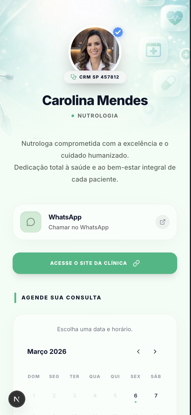 Uma página profissional e mobile-first com sua foto, especialidade e botão de agendamento.
